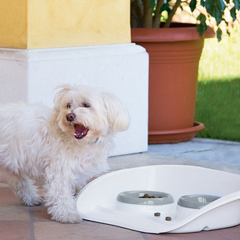 Plastic tray for dogs and cats, made up of two bowls with 0,25 and 0,30 lt capacity. cm 46x35x11h18,1″x13,8″x4,3″h 0,25+0,30