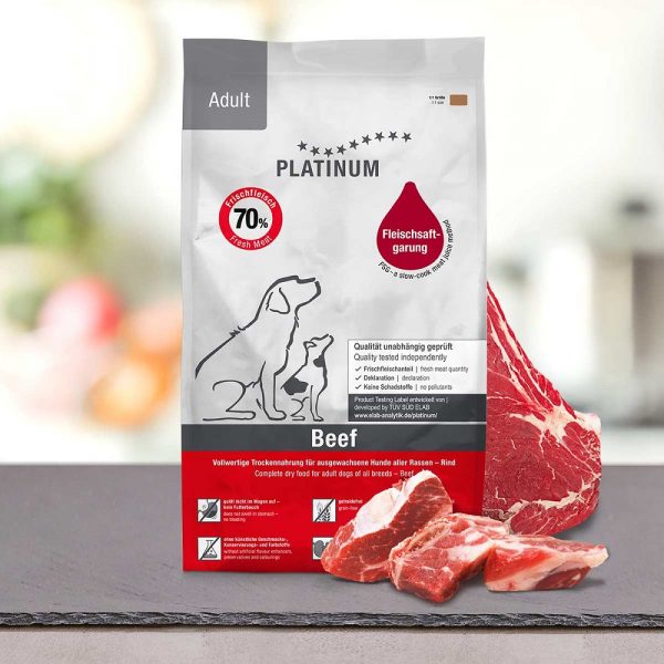 The complete food PLATINUM Adult Beef & Potato (FSG – Freshly Steamed & Gently dried) is suitable for adult dogs