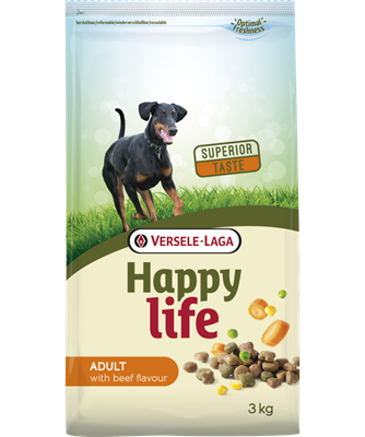 Varied food with beef flavour – for lively adult dogs Happy life Adult with Beef flavour is a tasty and