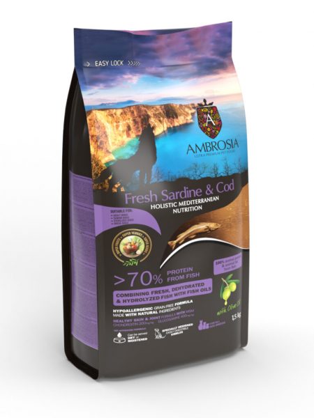 HOLISTIC MEDITERRANEAN NUTRITION FOR DOGS Ambrosia Fresh Sardine & Cod recipe combines easily digestible fish protein. It is specially formulated