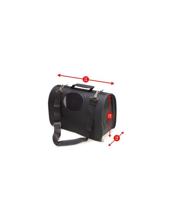 Semi-rigid bag with handle, briefcase for transporting pets and removable shoulder strap. Entries at the end by zippers, ventilation mesh.