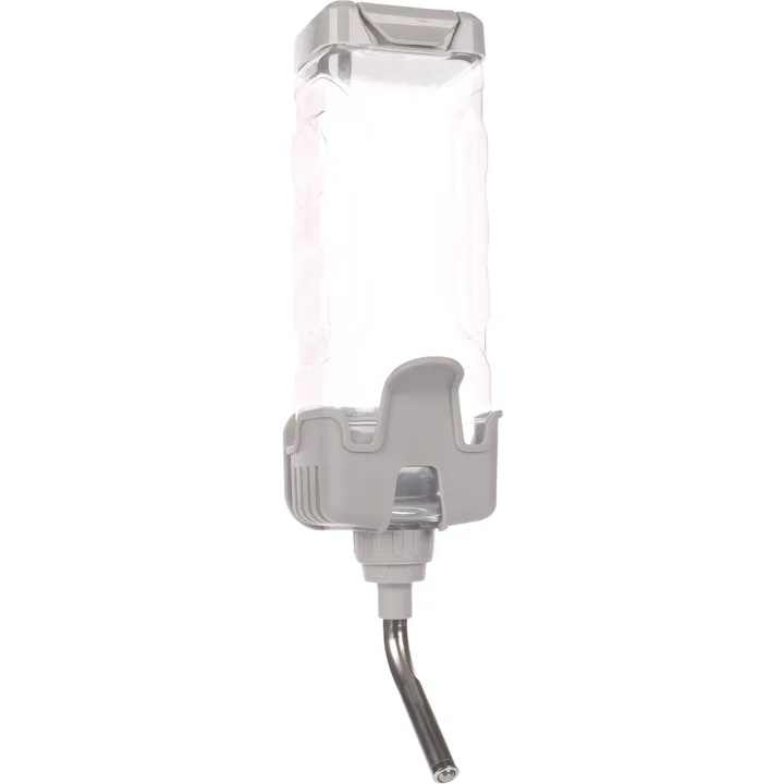 This handy light grey drinking bottle is perfect for your dog! Made of plastic and equipped with a flip-top lid that clicks shut. Ideal for wire crates and travel crates. Easy to assemble thanks to the twist screw. With a stainless steel ball valve, so no leaks. And you can easily remove the bottle from the holder.Material: plasticHinged lid that can be closed with a clickSuitable for wire cages and transport boxesEasy to assemble thanks to the rotating screwStainless steel nozzle with ball prevents the bottle from leakingThe bottle can be removed from the holder