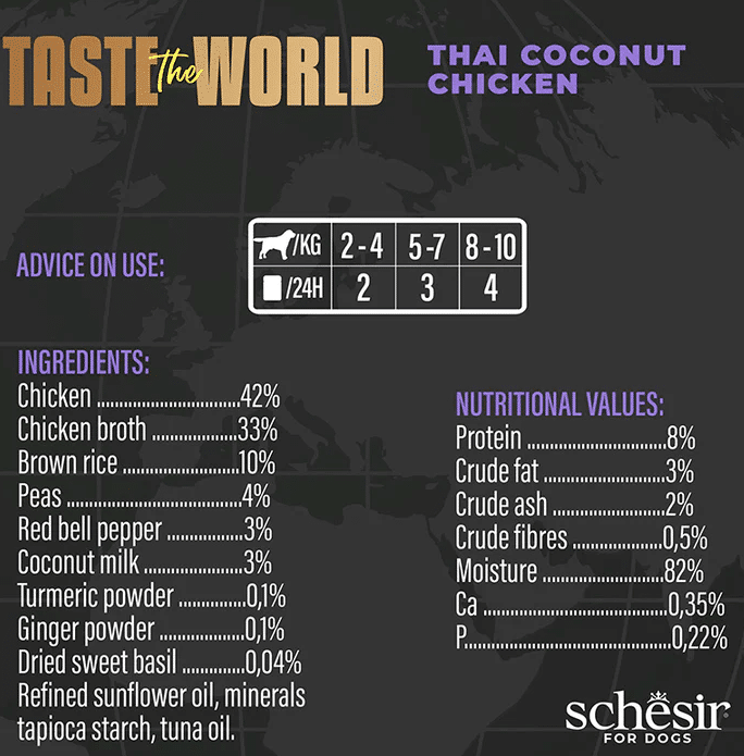 The chicken is accompanied with brown rice and coconut milk, plus tasty and original vegetables: a complete and balanced meal based on the Thai Coconut Chicken dish of Thai cuisine, offering your dog the quality of the ingredients in a delicious combination of flavours.