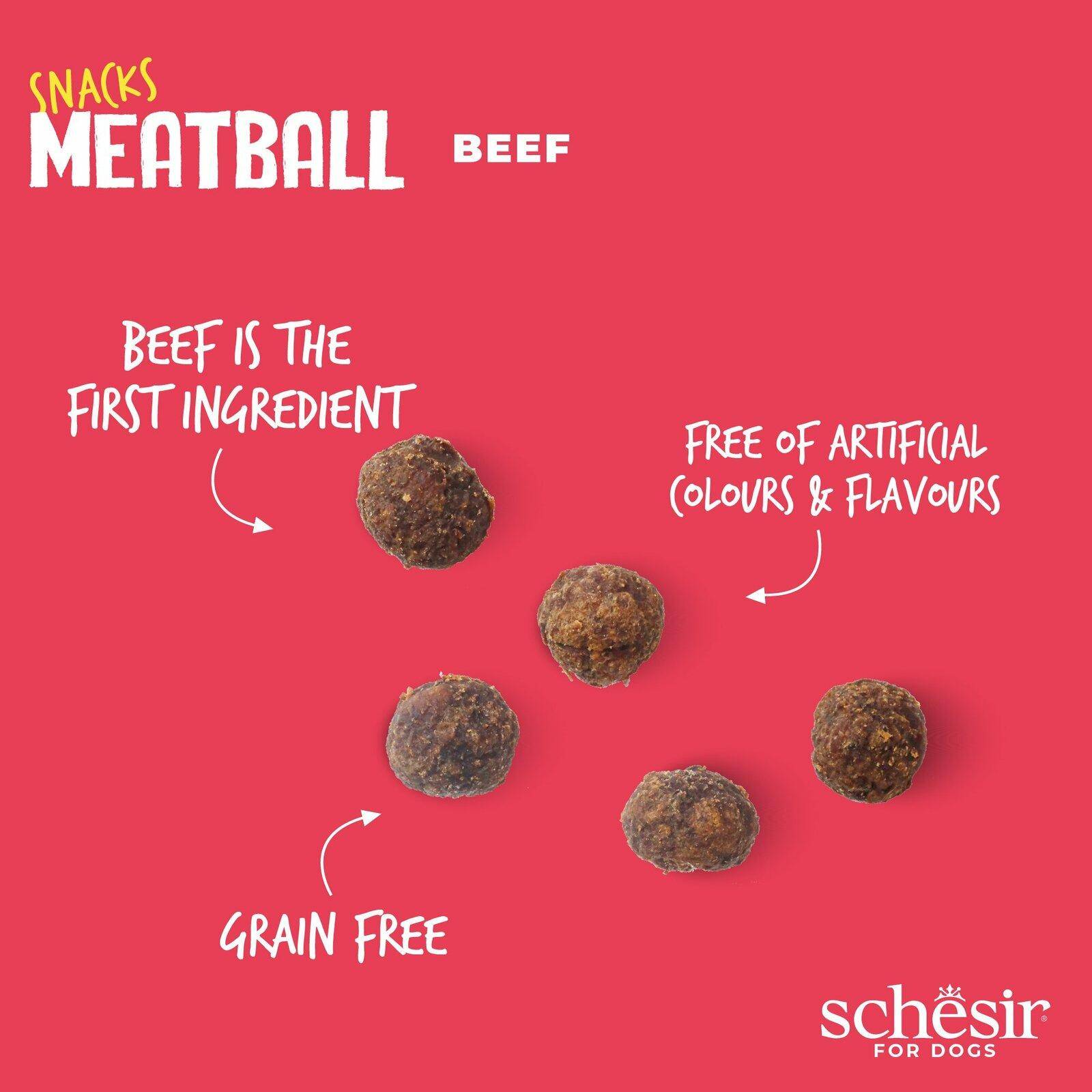 Schesir for Dogs Snacks – Meatballs, Beef. Beef is the First Ingredient. Grain Free. Free of Artificial Colours & Flavours. Made in the USA.