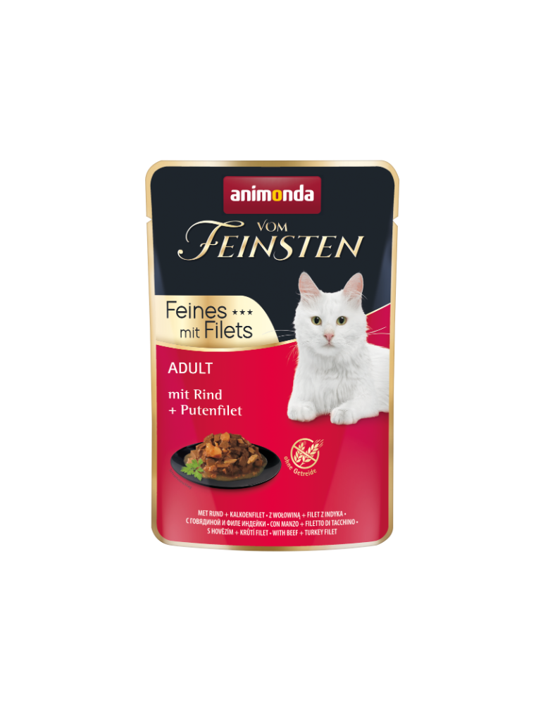 Vom Feinsten Adult Tasty choice with filet stands for well-balanced, delicious healthy nutrition at its best for adult cats from 1 – 6 years. The quality of the meaty raw ingredients in the tender chunks combined with delicious sauce and the finest filet pieces guarantees a unique delight. The fine gourmet ragouts provide the adult cat with all the essential nutrients it needs.