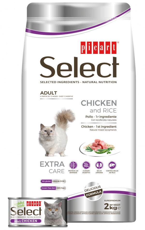 2kg SELECTED INGREDIENTS · NATURAL NUTRITION Picart Select ADULT Chicken and Rice Complete and balanced nutrition for cats from 12 months