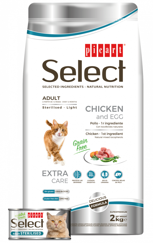 400gr 2kg 8kg SELECTED INGREDIENTS · NATURAL NUTRITION Picart Select ADULT Chicken and Egg Sterilised – Light Complete and balanced food,