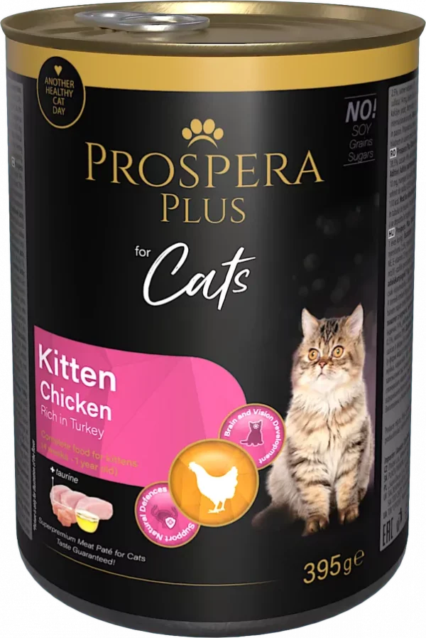 Prospera Plus Kitten Chicken pâté, rich in turkey. Complete and balanced food for kittens aged 4 weeks to 1 year. The product’s